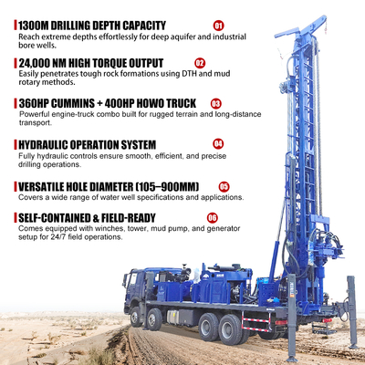 Temel Özellikler | 1300m Maksimum Derinlik - Derin yeraltı sularında ve zorlu jeolojik katmanlarda güç | Hidrolik Tahrik Sistemi - Pürüzsüz, verimli ve tamamen kontrol edilebilir operasyonlar |